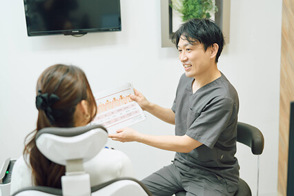 口腔内写真やレントゲン画像、説明用資料などを取り入れ、現在のお口の状態や治療の内容を視覚的にも理解しやすい形でご説明します。