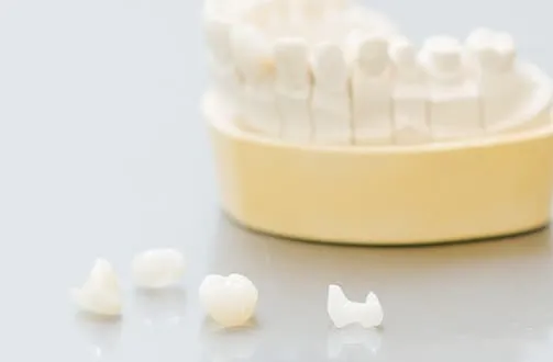 ジルコニアでつくる人工歯です。ジルコニアは白く美しいうえ、金属のような強度があるのが特長です。そのため咬み合う力が強い奥歯やブリッジにも使用できます。ただ、細かい色調の再現は難しい素材です。
