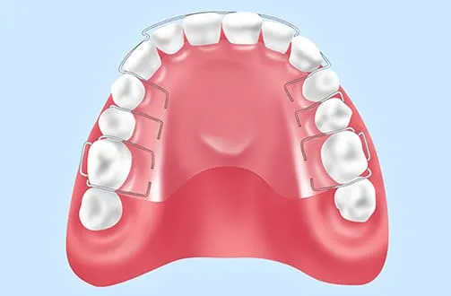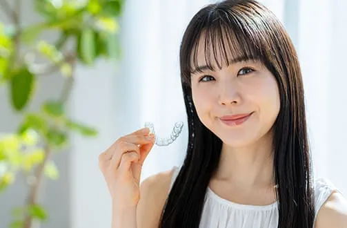 透明な樹脂製のマウスピースを使った矯正装置です。ブラケット自体が透明で薄いので、近くから見てもほとんど装置が目立ちません。また、取り外しが可能なのでお食事やブラッシングの邪魔になりません。